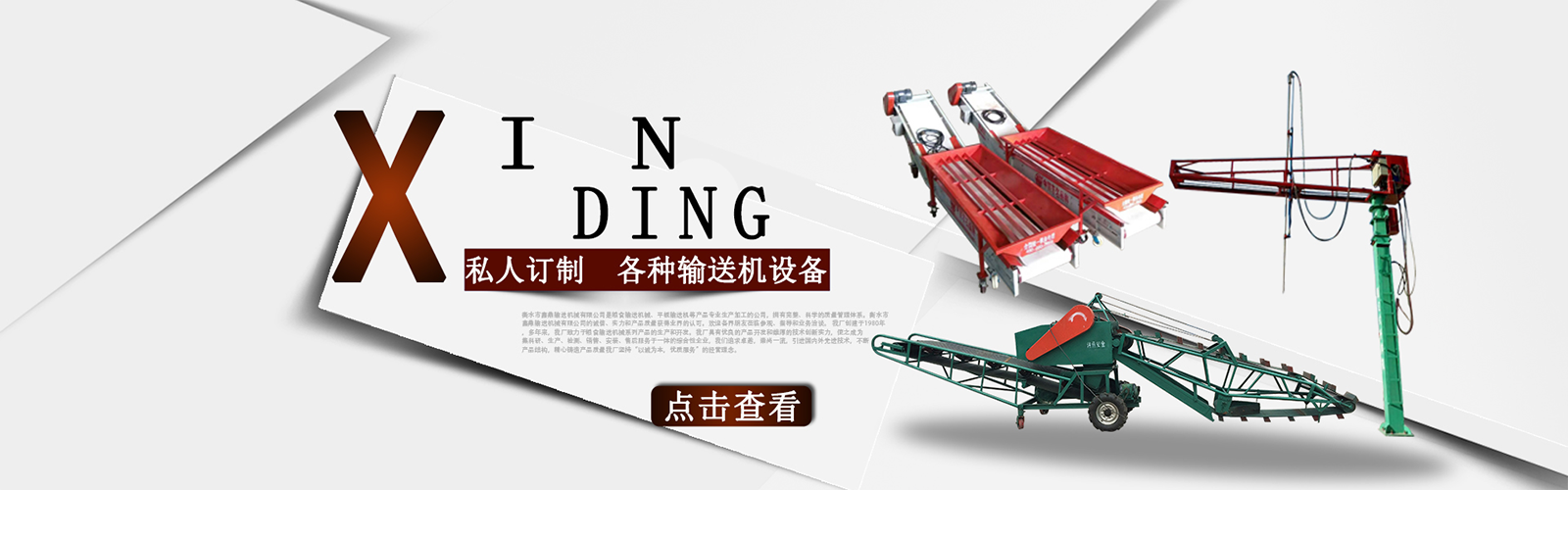 衡水市鑫鼎輸送機(jī)械有限公司是糧食輸送機(jī)械、平板輸送機(jī)等產(chǎn)品專(zhuān)業(yè)生產(chǎn)加工的公司,擁有完整、科學(xué)的質(zhì)量管理體系。衡水市鑫鼎輸送機(jī)械有限公司的誠(chéng)信、實(shí)力和產(chǎn)品質(zhì)量獲得業(yè)界的認(rèn)可。歡迎各界朋友蒞臨參觀(guān)、指導(dǎo)和業(yè)務(wù)洽談。 我廠(chǎng)創(chuàng)建于1980年,多年來(lái),我廠(chǎng)致力于糧食輸送機(jī)械系列產(chǎn)品的生產(chǎn)和開(kāi)發(fā)。我廠(chǎng)具有優(yōu)良的產(chǎn)品開(kāi)發(fā)和雄厚的技術(shù)創(chuàng)新實(shí)力,使之成為集科研、生產(chǎn)、檢測(cè)、銷(xiāo)售、安裝、售后服務(wù)于一體的綜合性企業(yè),我們追求卓越,崇尚一流,引進(jìn)國(guó)內(nèi)外先進(jìn)技術(shù),不斷產(chǎn)品結(jié)構(gòu),精心鑄造產(chǎn)品質(zhì)量我廠(chǎng)堅(jiān)持“以誠(chéng)為本,優(yōu)質(zhì)服務(wù)”的經(jīng)營(yíng)理念。。積極拓展市場(chǎng),贏(yíng)得了廣大客戶(hù)的信賴(lài)和一致好評(píng)。產(chǎn)品暢銷(xiāo)山西、山東、遼寧、黑龍江、吉林、北京、天津、內(nèi)蒙古等28個(gè)省、市、自治區(qū)。
